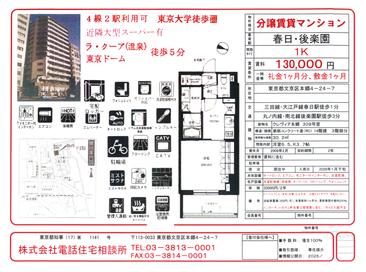 株式会社 電話住宅相談所 東京 都文京区本郷4-24-7 Tel.03-3813-0001 FAX03-3814-0001 都営三田線「春日駅」A6出口 徒歩1分