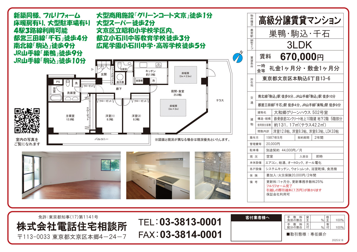 株式会社 電話住宅相談所 東京 都文京区本郷4-24-7 Tel.03-3813-0001  FAX03-3814-0001 都営三田線「春日駅」A6出口 徒歩1分