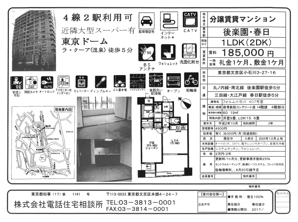 (株)電話住宅相談所 東京都文京区本郷4-24-7 Tel03-3813-0001 FAX03-3814-0001 都営三田線春日駅 A6出口 歩1分 マクドナルド隣 |